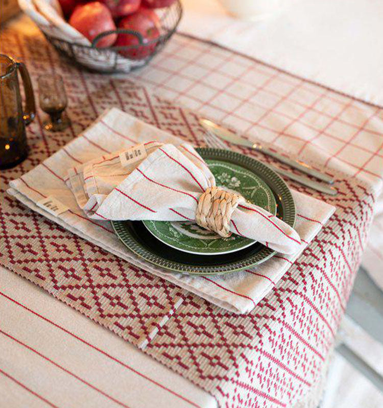 Den röda Lucas duken är det perfekta tillskottet till din dukning, särskilt under högtider och festliga tillfällen. Tillverkad av återvunnet material, den kombinerar både stil och hållbarhet. Den djupa, varma röda nyansen tillför en elegant och inbjudande känsla till vilket rum som helst.