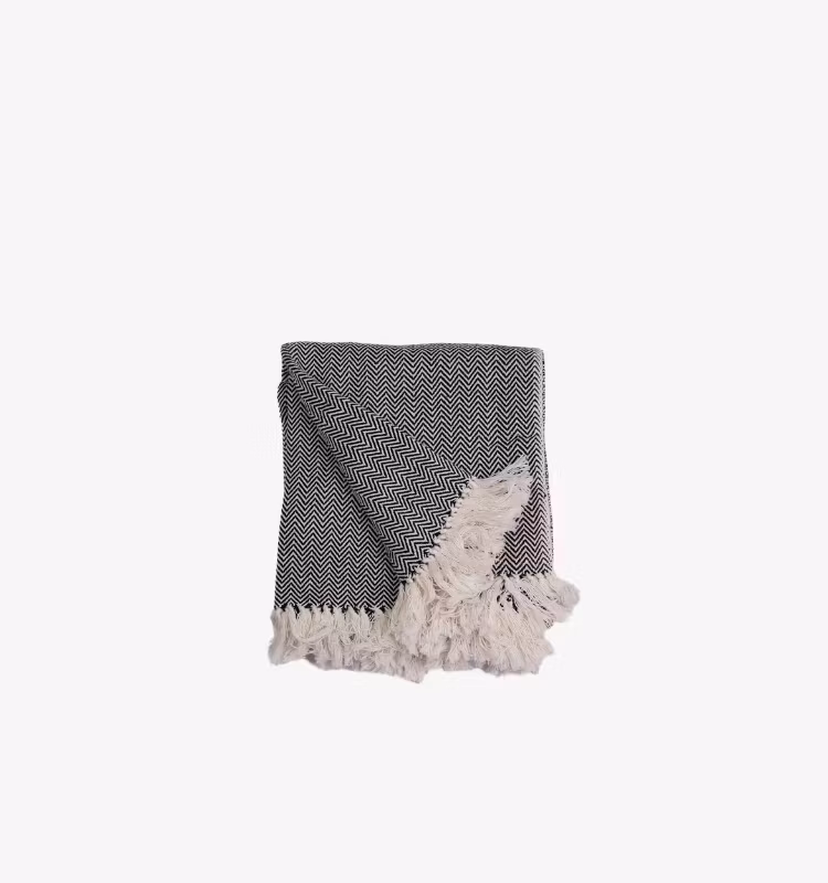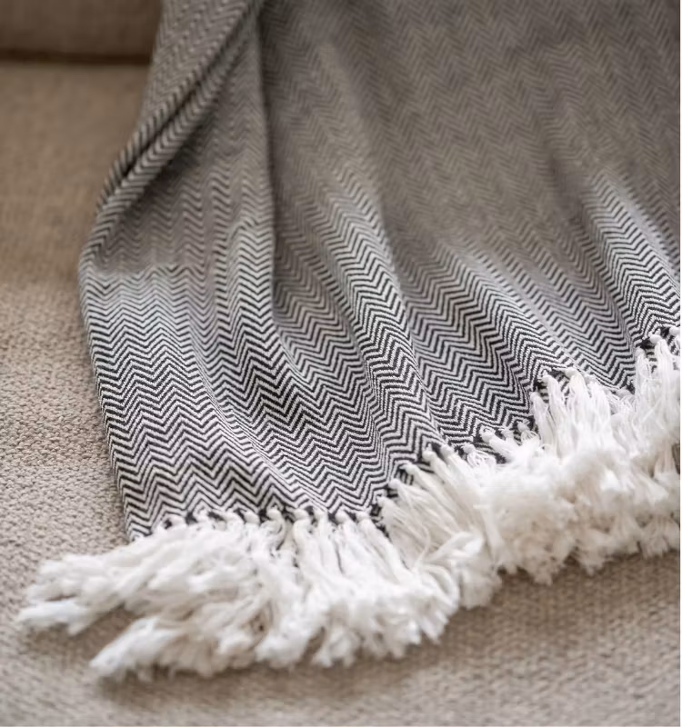 Vävd pläd i fiskbensmönster producerad i 100% återvunnen bomull. Denna pläd är skön som yogapläd eller som en mjuk myspläd i soffan.