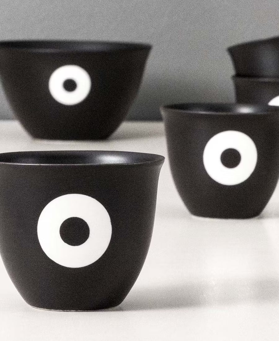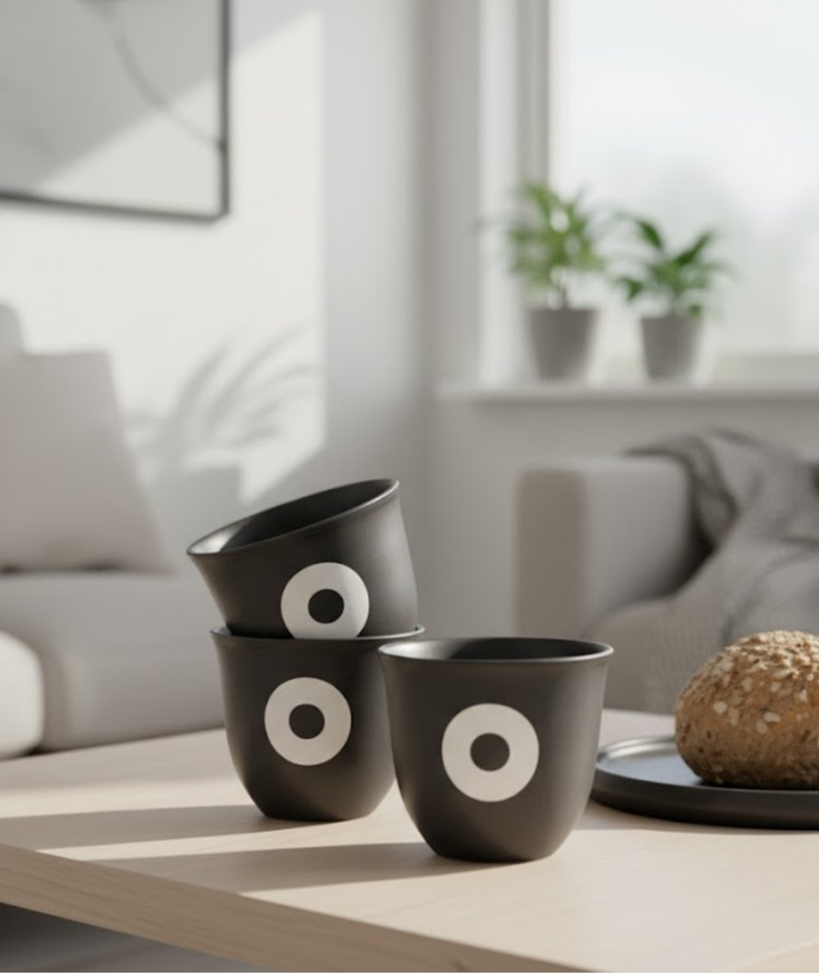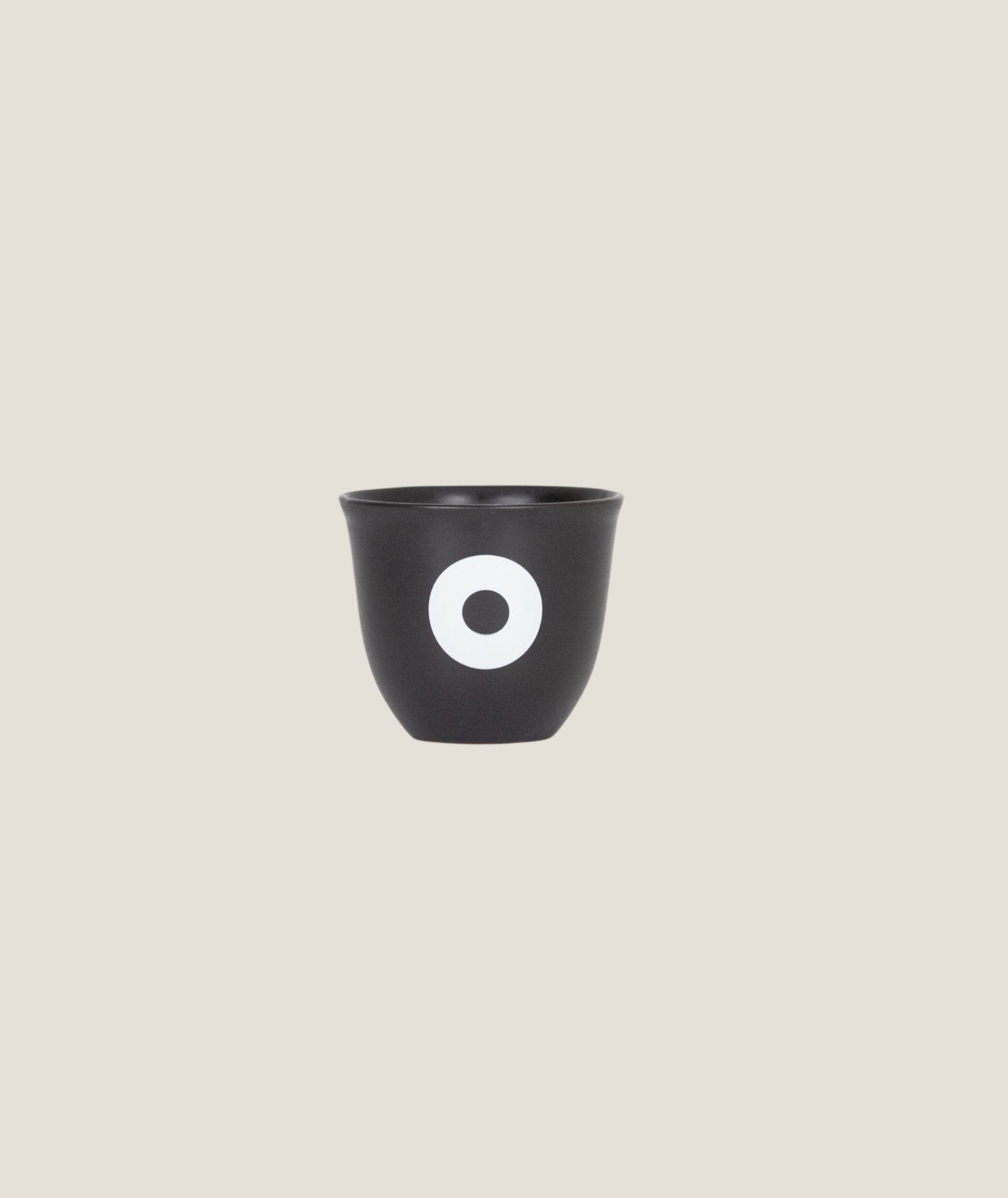 Material stengods med en matt svart glasyr och dekorerad med rotors ring.