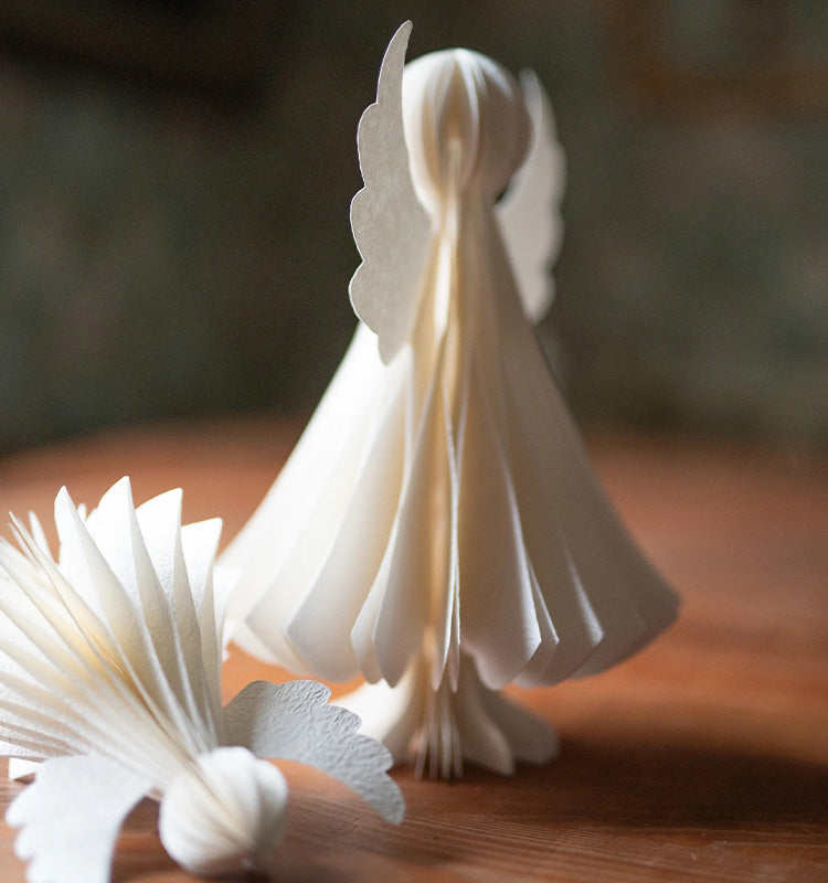 Skapa en fridfull och elegant julstämning med vår vita pappersängel. Med sin stilrena design och mjuka vita nyans passar den perfekt som dekoration i granen, i fönstret eller på bordet. Ängeln är tillverkad av hållbart papper och kan enkelt vikas ihop för smidig förvaring, så att den kan pryda ditt hem varje jul. En tidlös dekoration som sprider lugn och skönhet under hela säsongen.