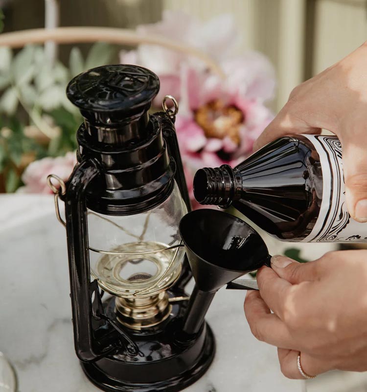 Fyll din fotogenlykta, kök eller kamin som vanligt. Viktigt! Se till att förbränningskällan är släckt och kall innan påfyllning.