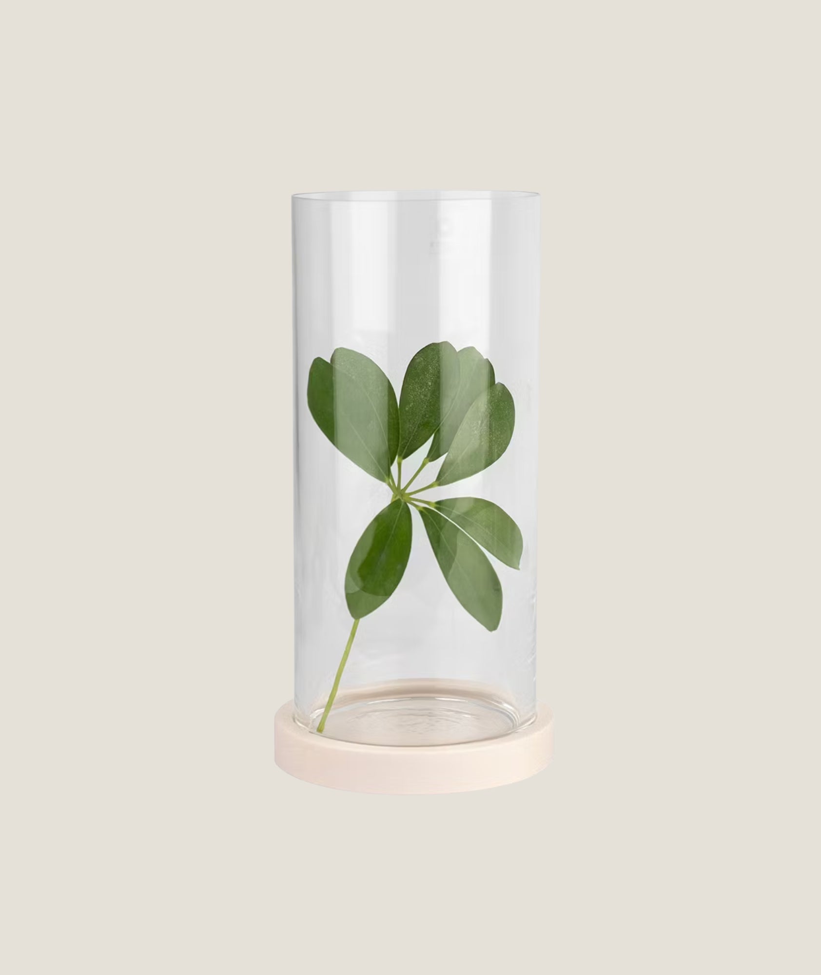 Storlek: Glascylindern är 11cm i diameter och 26cm hög, trä-fatet/-locket är 13cm i diameter och 2cm högt.