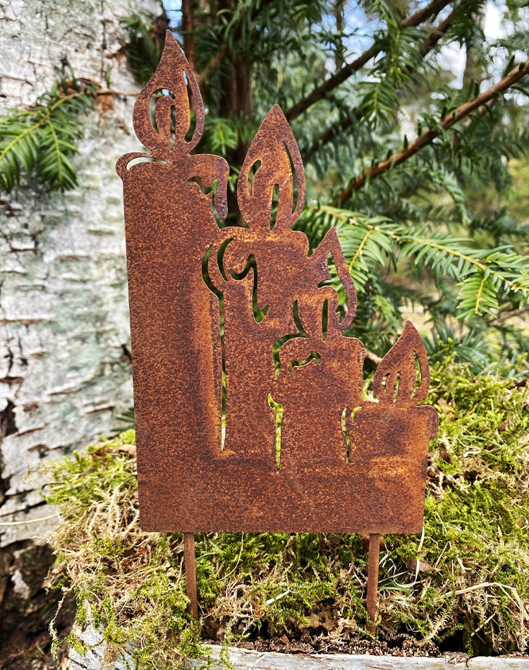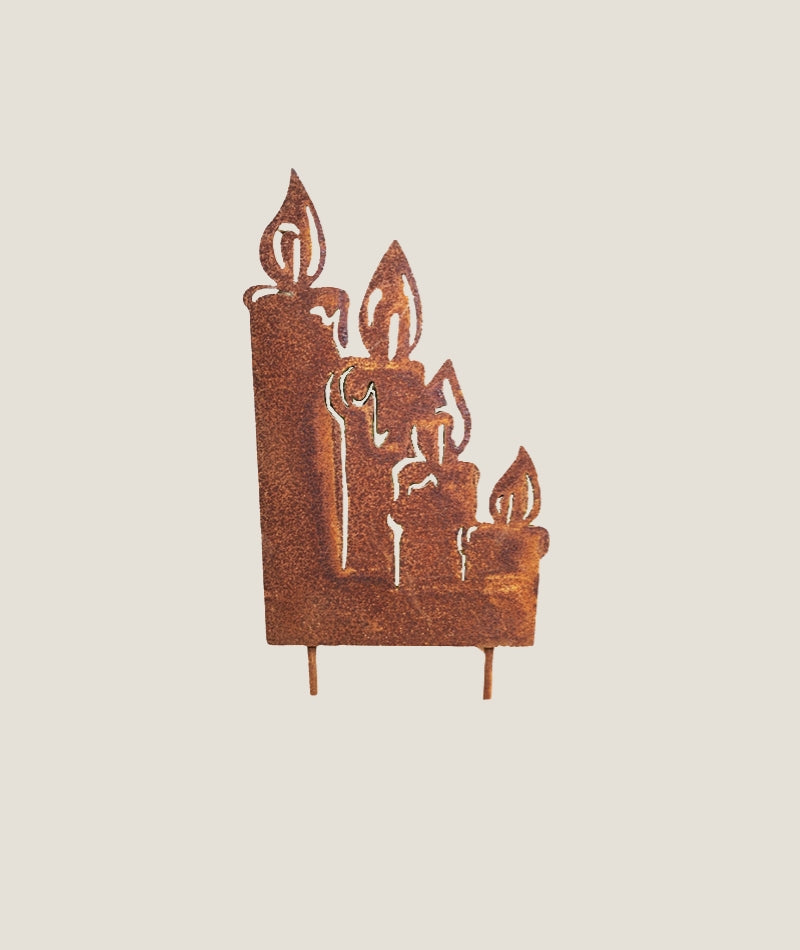 Dekoration Fyra ljus på pinne i rostfinish är en inredningsdetalj som förmedlar en känsla av värme och mysighet till ditt hem och trädgård. Dess rustika finish och eleganta design ger den en tidlös skönhet som kommer att vara uppskattad under hela året.