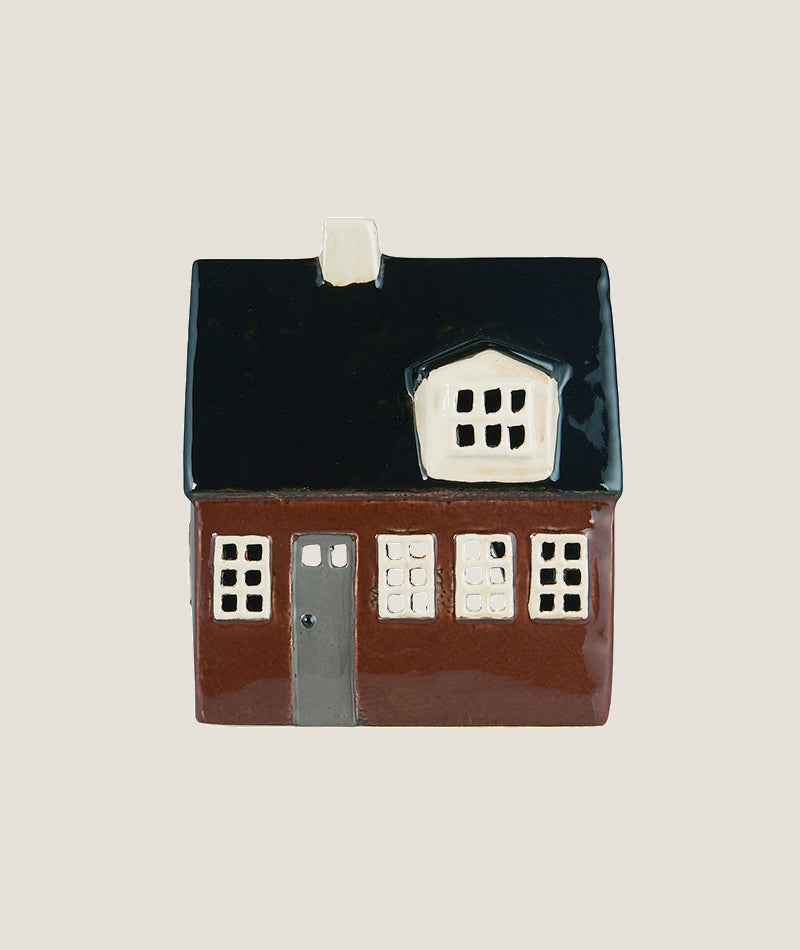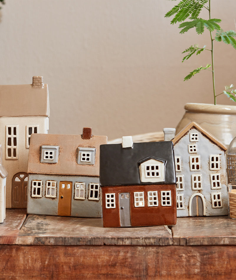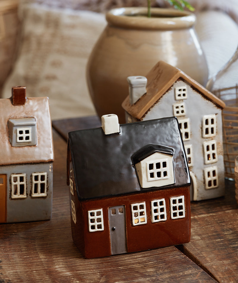 Utforska vår kollektion av hus för värmeljus i keramik, utformade i en varm och charmig brun nyans som hämtar inspiration från de ikoniska Nyhavn-husen i Köpenhamn. Varje hus är ett mästerverk av små detaljer och glansig keramik, fångar själen av den berömda kvarteret vid vattnet.