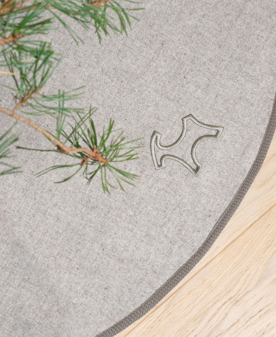 Bandkantad julgransmatta med broderad bock i samma färg som bandkanten.