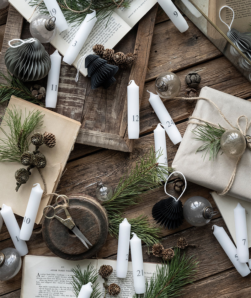Kalenderljuset har en enkel och tidlös design, med de numrerade dagarna tryckta på ytan, vilket ger en rustik och traditionell känsla.