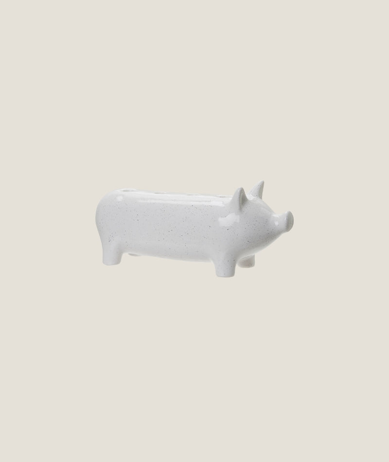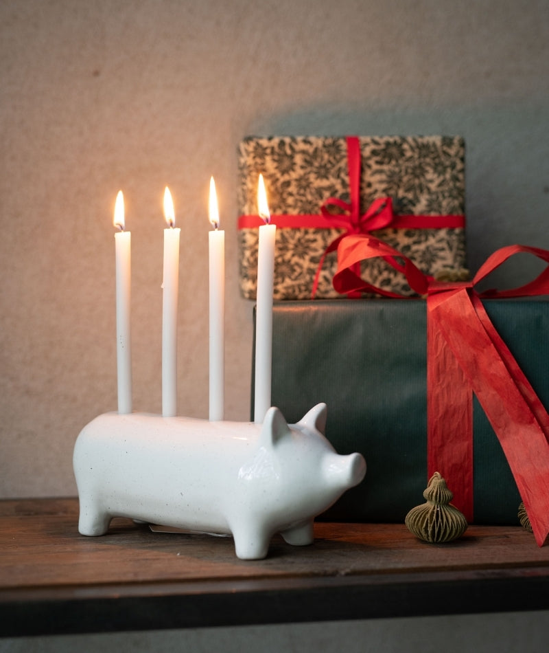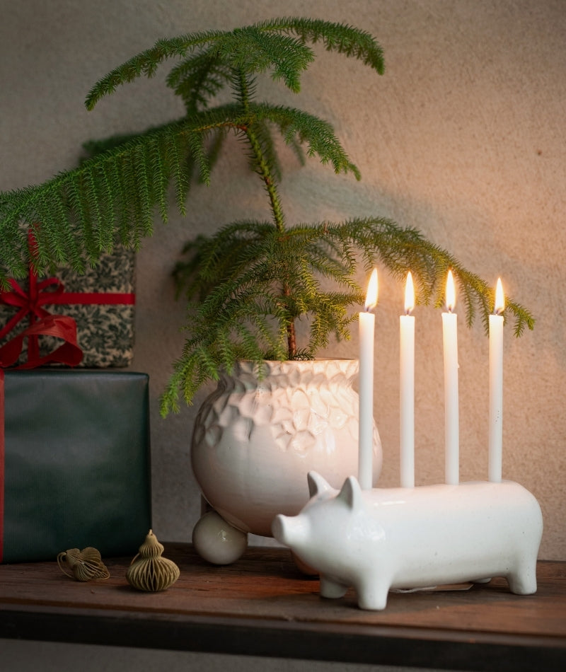 Skapa en unik och lekfull atmosfär i ditt hem med Kim Ljusstake för 4 ljus i form av en gris, tillverkad i röd porslin från Wikholm Form. Denna charmiga ljusstake blir ett blickfång i vilket rum som helst, och den rustika vitmelerade ytan ger en varm och hemtrevlig känsla. Perfekt som en humoristisk detalj i vardagsrummet eller som en oväntad överraskning i din ljusinredning.