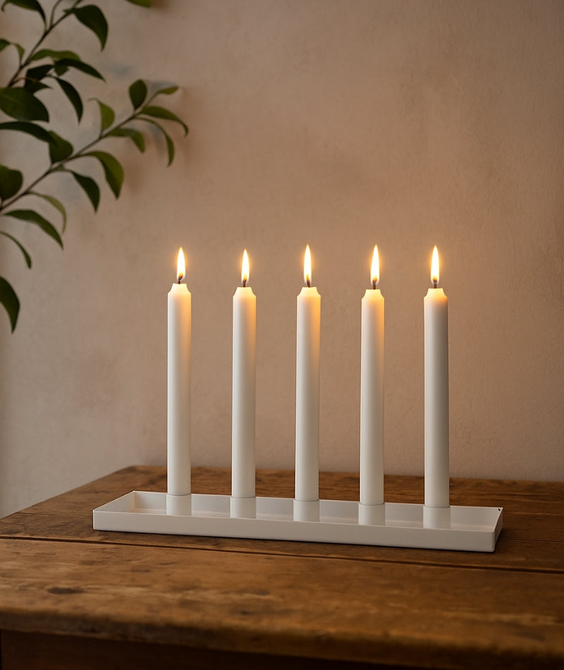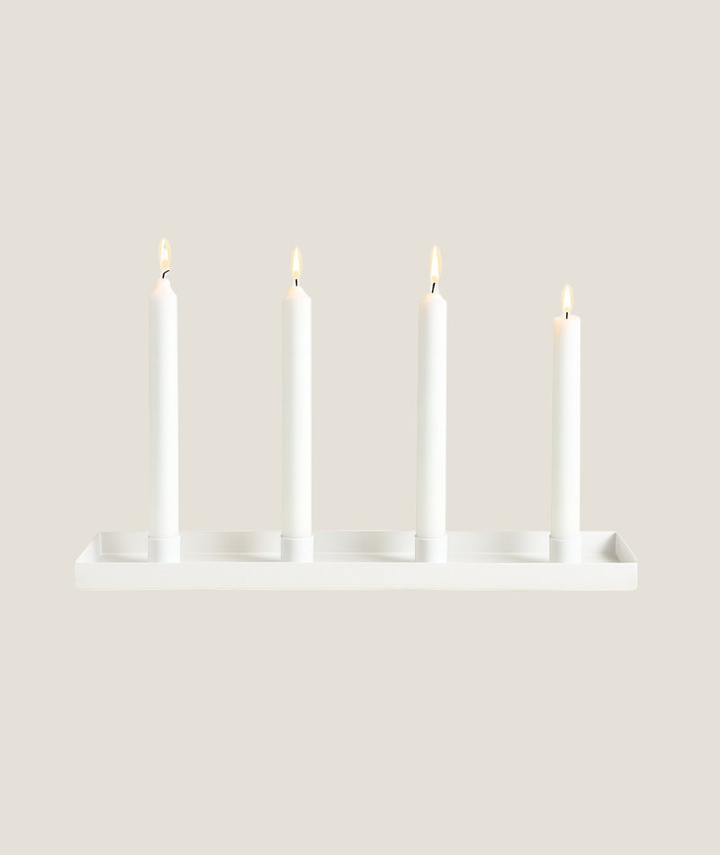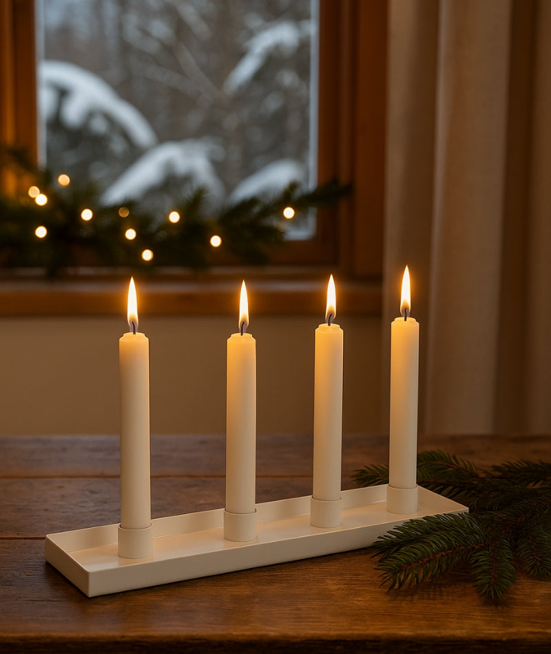 En stilren ljusform i vitlackerad metall som rymmer fyra ljus och skapar en elegant, harmonisk punkt i hemmet. Perfekt för dukningar, fönster eller som modern adventsljusstake med en tidlös och ren design.