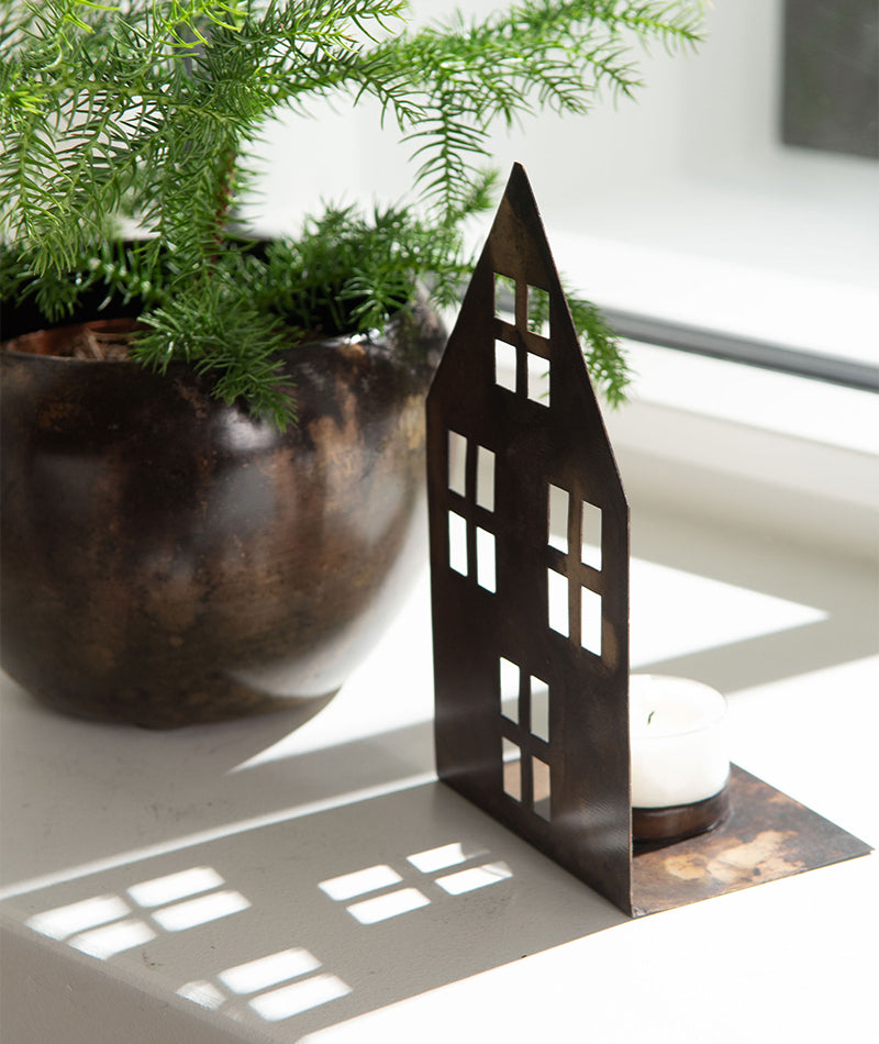 Skapa en hemtrevlig och mysig känsla med Ljushållare Hus i antik brun finish! Tillverkad i robust metall och färgad i en varm brun nyans, är denna ljushållare utformad som ett charmigt litet hus. När ett ljus tänds inuti sprids ett mjukt och inbjudande sken genom de utskurna fönstren och dörren, vilket skapar en förtrollande atmosfär i rummet. Perfekt att placera på bordet, i fönstret eller på en hylla för att ge hemmet en rustik och antik känsla. Ljushållare Hus Antik Brun är en vacker och tidlös dekoration som ger värme och stämning året runt!