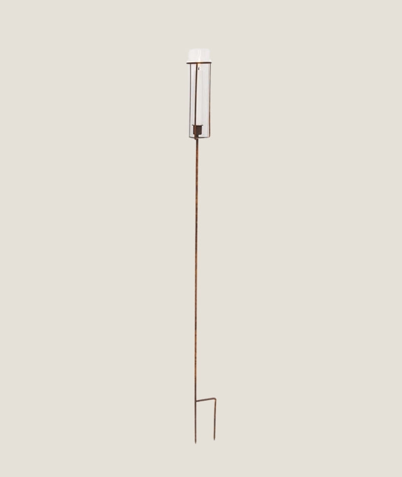 Ljusstaken Eldvakt är inte bara en praktisk ljushållare utan också ett konstverk för din trädgård. Tillverkad av rostfritt järn med stormglas för att skydda kronljuset, kommer denna ljusstake med ett robust markfäste av rundjärn för stabilitet.
