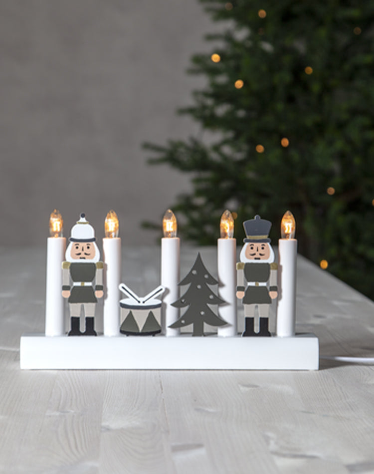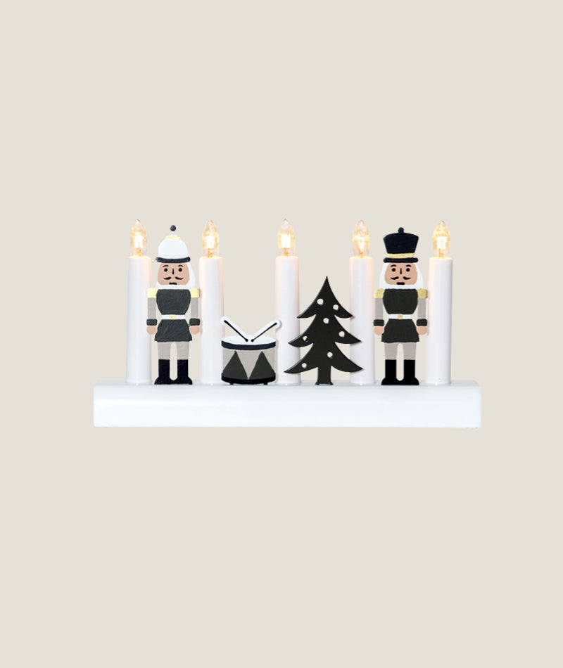 Ljusstaken har plats för fem ljuskällor, vilket ger ett vackert sken som sprider en varm och inbjudande atmosfär i ditt hem. De detaljerade dekorationerna på ljusstaken, inklusive de två nötknäpparna som står på var sin sida av ljusstaken, trumman och granen, ger den en charmig julig karaktär. Dessa element bidrar till att göra din juldekoration komplett och fängslande.