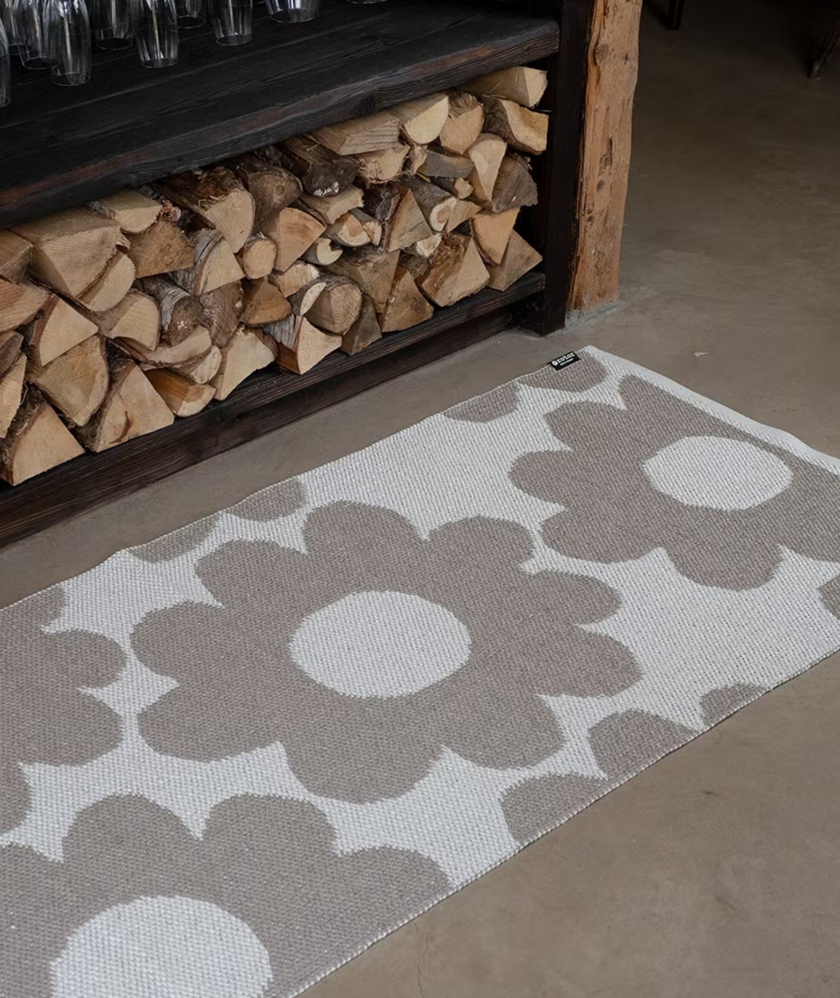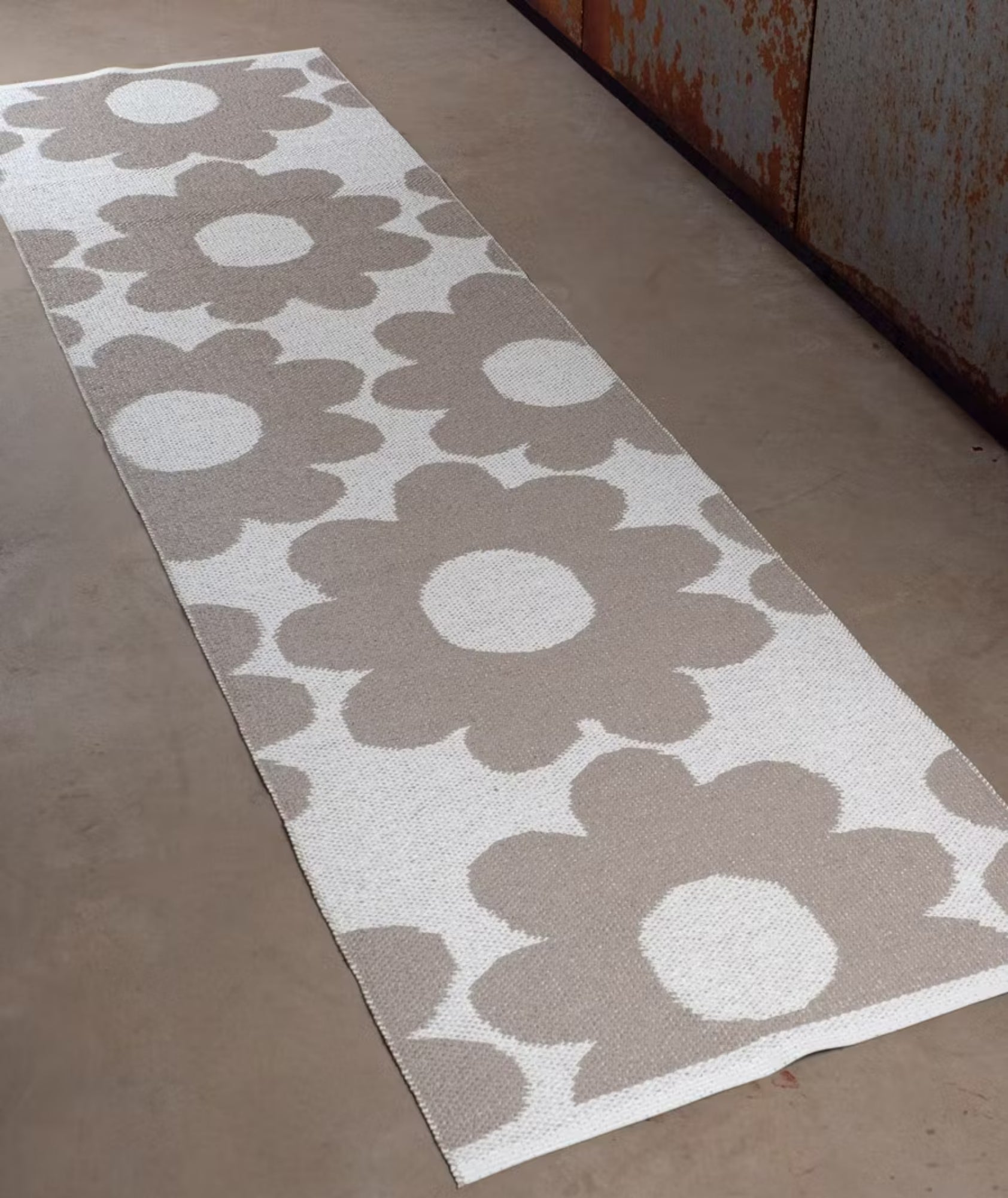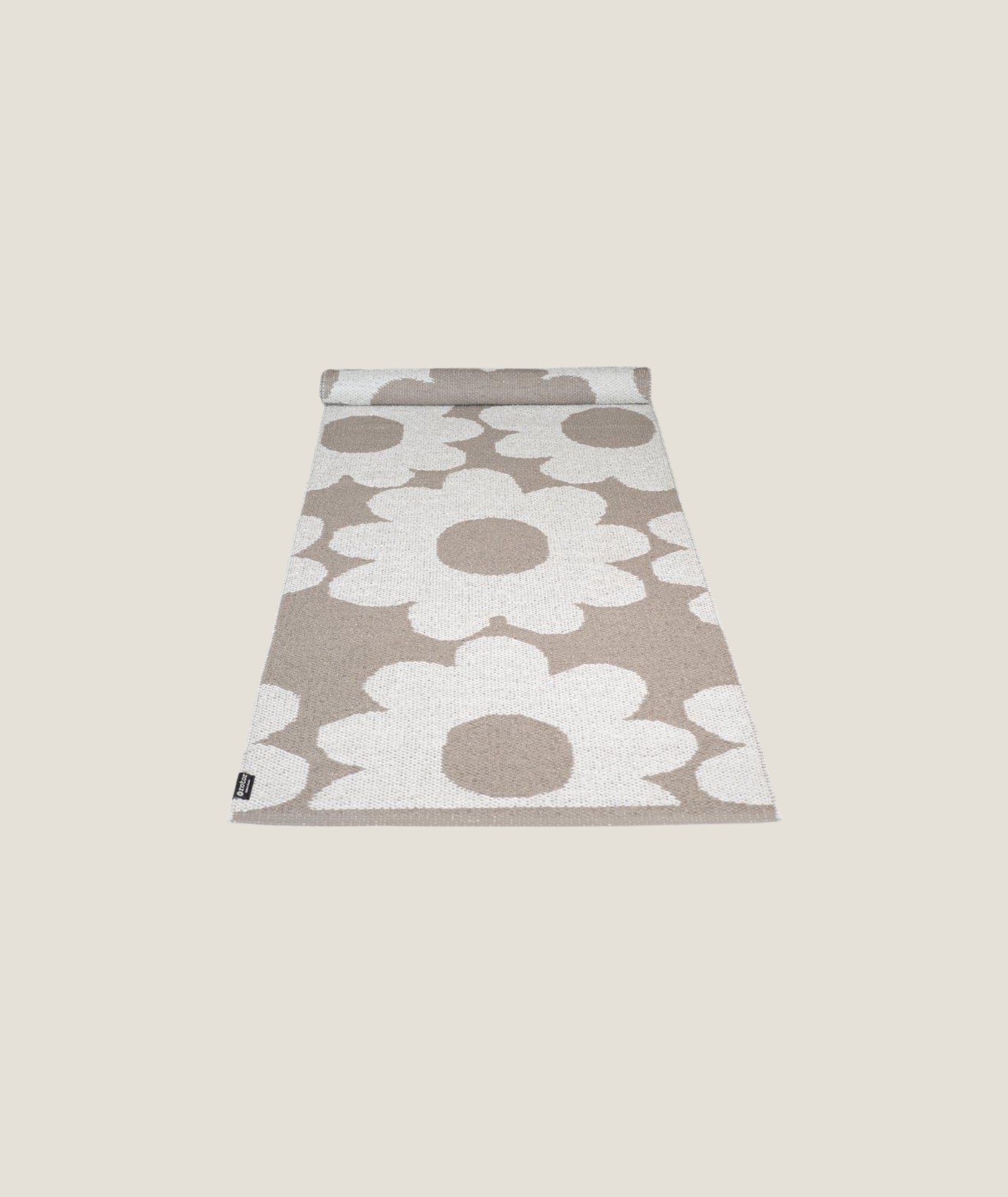 Plastmatta Flora i beige/vitt, perfekt för både inomhus- och utomhusmiljöer.