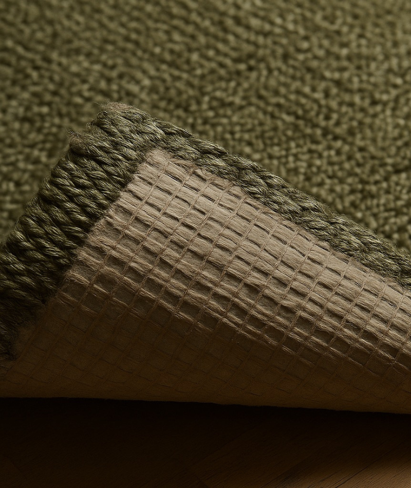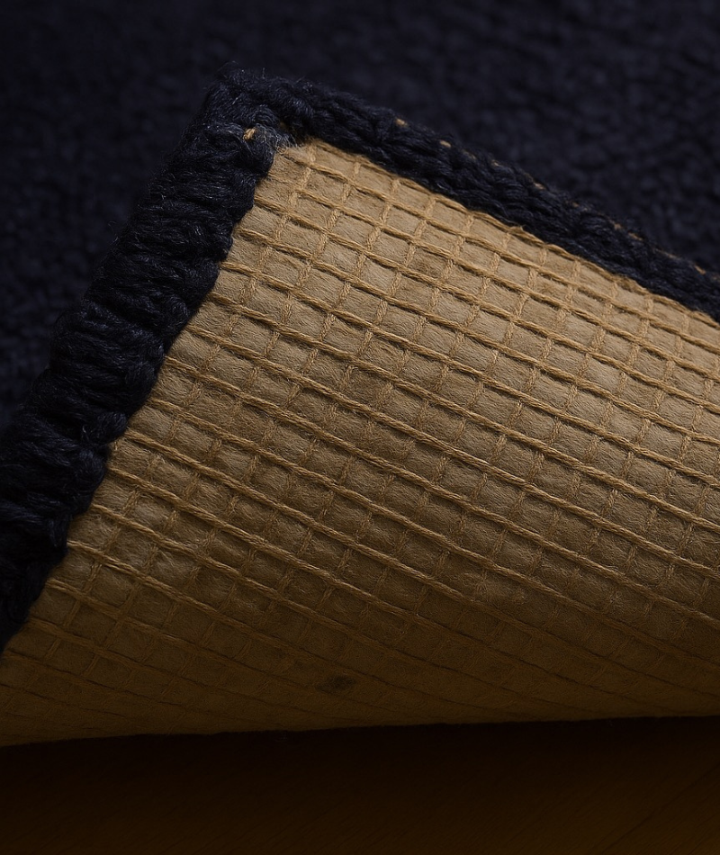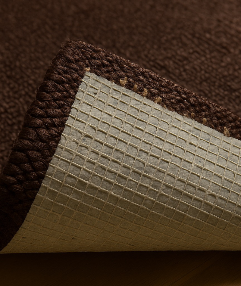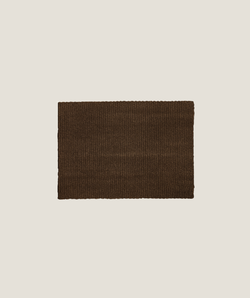 Naset vävs i 5-ply handspunnen jute som ger en tät och kraftig struktur. Dörrmattans garn finns både i ursprungliga nyanser och i färgat garn, där det färgade går i jordnära toner som skapar en balanserad helhet. Latexbaksidan gör att mattan ligger stadigt på golvet, även i entréer med mycket rörelse. De invikta kanterna förstärker konstruktionen och skyddar mot