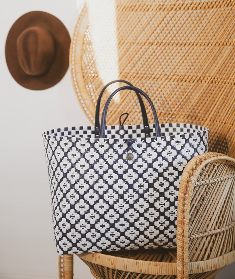 Handed By - Motif Bag shopper är en trendig  vävd väska. Perfekt att ha till stranden eller när du ska gå och handla.  Läderhandtagen i PU gör att väskan kan bäras bekvämt och ger den ett lyxigt utseende.  Handgjort  med återvunnen plast.
