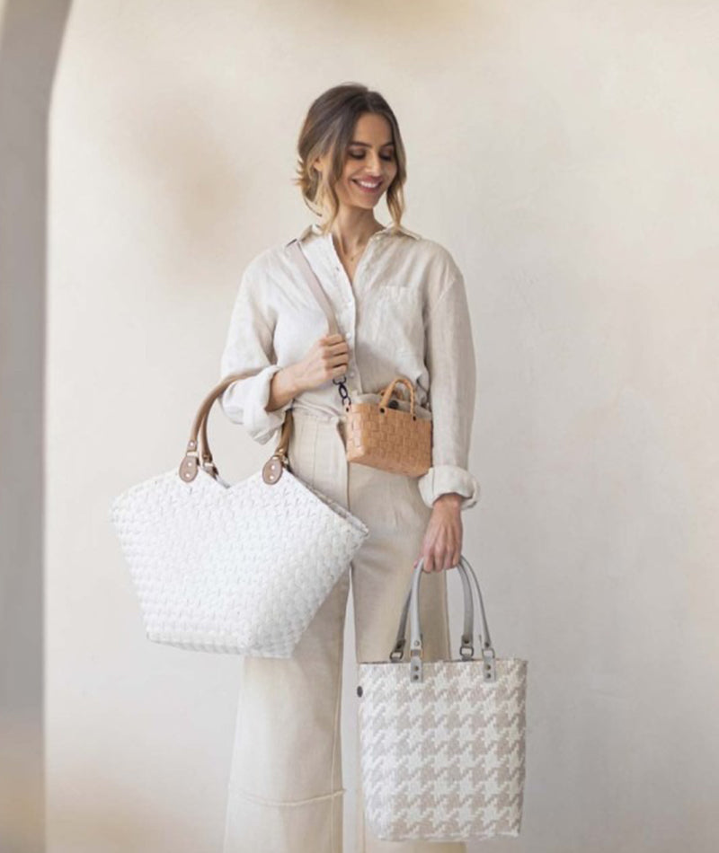 Handed By - Mayfair shopper är en trendig vävd väska. Perfekt att ha till stranden eller träningen. Läderhandtagen i PU gör att väskan kan bäras bekvämt och ger den ett lyxigt utseende. Handgjort med återvunnen plast.