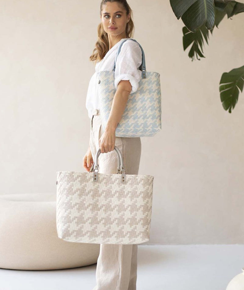 Handed By - Mayfair grand shopper är en trendig vävd väska. Perfekt att ha till stranden eller när du ska gå och handla. Läderhandtagen i PU gör att väskan kan bäras bekvämt och ger den ett lyxigt utseende. Handgjort med återvunnen plast.