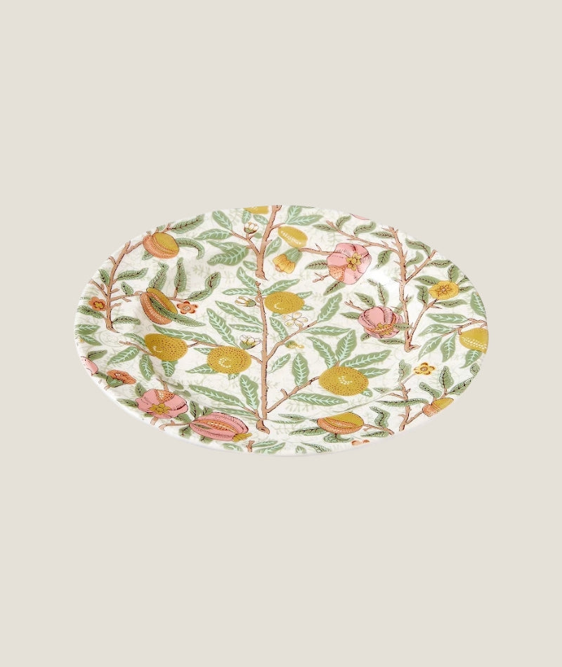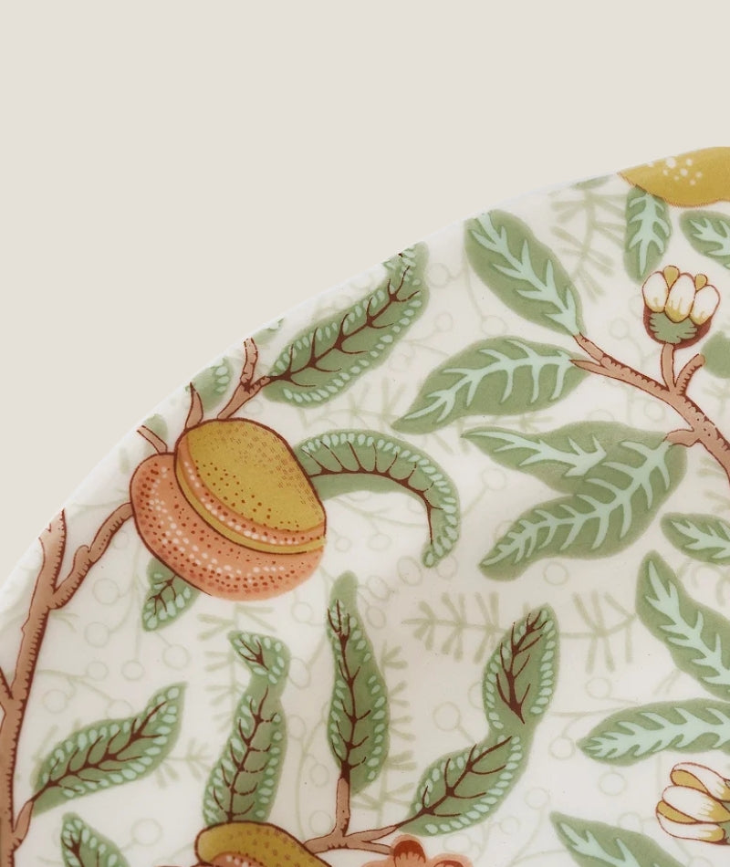 Ge din borddukning en touch av det ikoniska arvet från William Morris med denna tallrik från Spode. Tallriken är prydd med arvsmönstret Fruits hämtat direkt från William Morris & Co.'s arkiv och presenterade i vackra nyanser av grönt, gult och rosa. Den mjuka färgskalan och det genomgående mönstret erbjuder en fräsch maximalistisk stil för ditt bord. Använd den ensam vid lunchservering eller som en del av din bordsdukning tillsammans med Standen-dinnertallrikarna för en imponerande effekt.