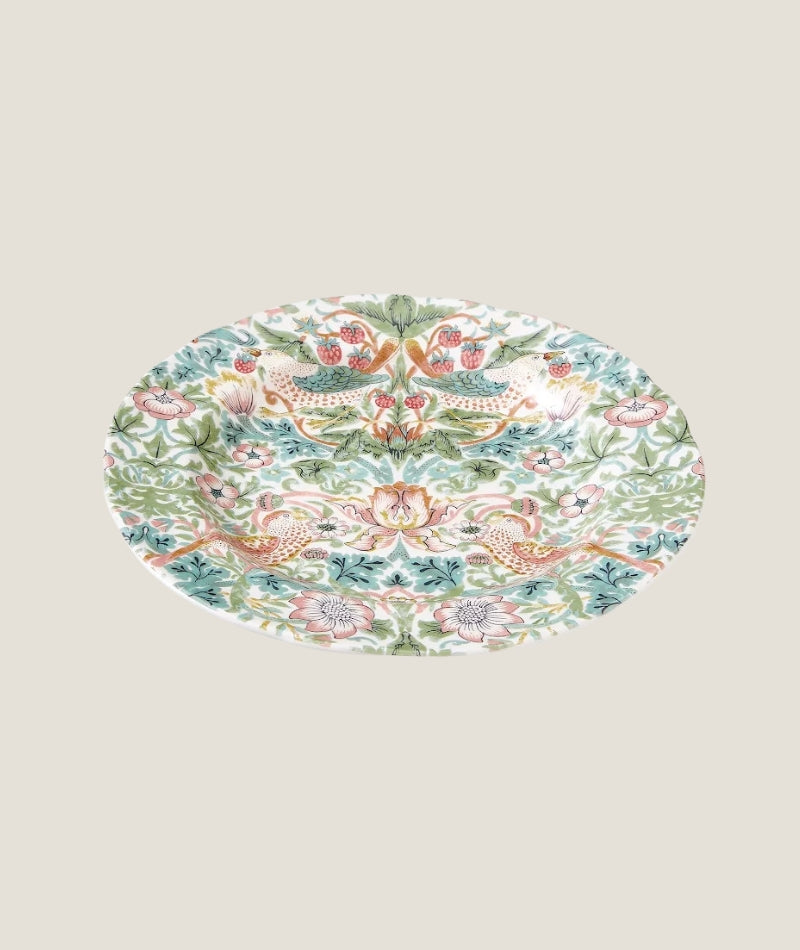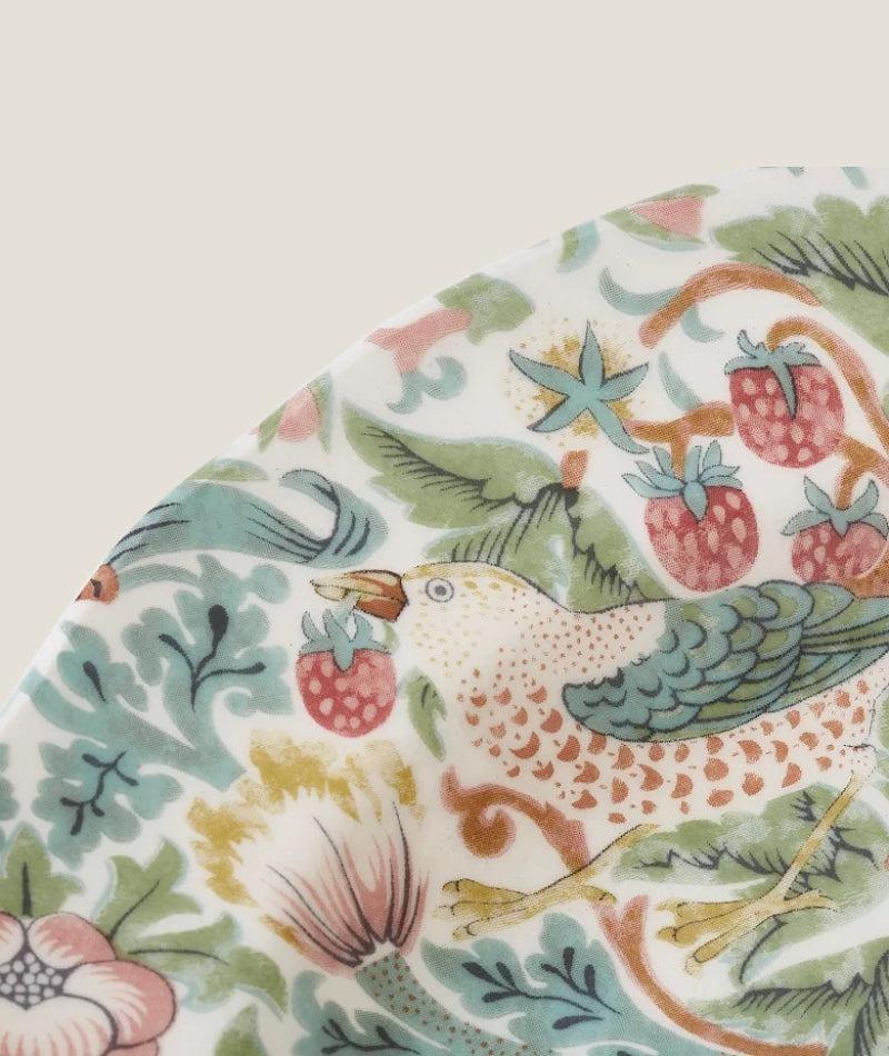 Ge din borddukning en touch av det ikoniska arvet från William Morris med denna tallrik från Spode. Tallriken är prydd med arvsmönstret Strawberry Thief hämtat direkt från William Morris & Co.'s arkiv och presenterade i vackra nyanser av grönt, gult och rosa. Den mjuka färgskalan och det genomgående mönstret erbjuder en fräsch maximalistisk stil för ditt bord. Använd den ensam vid lunchservering eller som en del av din bordsdukning tillsammans med Standen-dinnertallrikarna för en imponerande effekt.
