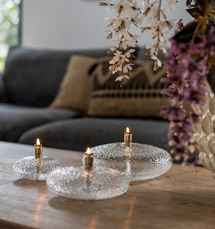 Denna stilrena och lågprofilerade oljelampa från Peri Living är tillverkad i klart glas och metall, vilket ger ett elegant och tidlöst uttryck. Den transparenta designen gör att ljuset reflekteras vackert i glaset och att oljenivån syns tydligt ? en praktisk och dekorativ detalj i ett och samma föremål.