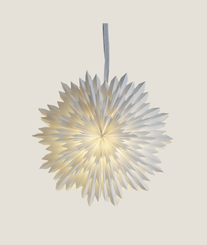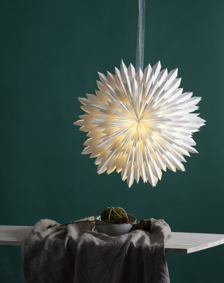 Stjärnan är tillverkad av tre lager veckat papper, vilket ger den en imponerande struktur och stadighet. Den ojämna konturen på stjärnan bidrar till dess vintriga karaktär och ger den en autentisk känsla. Den levereras med ett elegant band som gör det enkelt att hänga upp den var som helst i ditt hem.