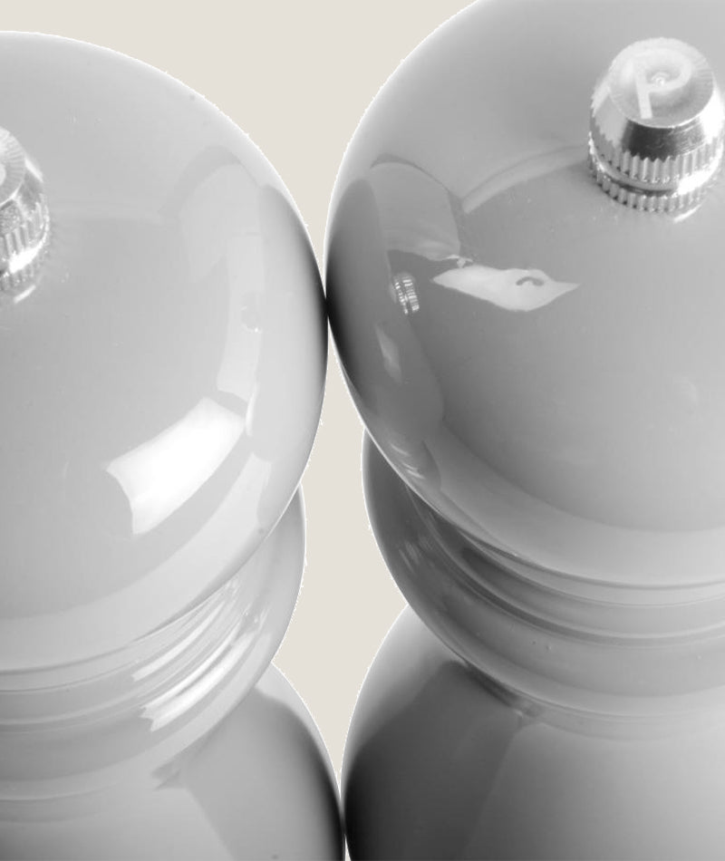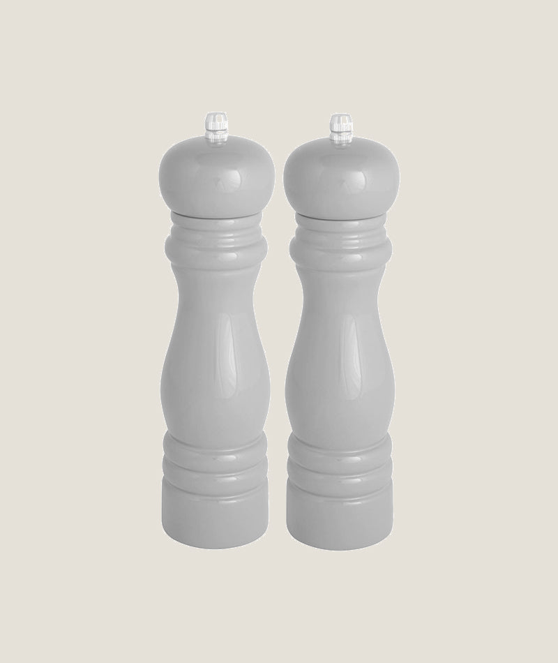 Detta set med salt- och pepparkvarnar kombinerar smidig design med hållbara material för att erbjuda både estetisk tilltalande och praktiska köksredskap. Den gråa färgen och trädetaljerna skapar en tidlös och elegant estetik som kompletterar din dukning perfekt.