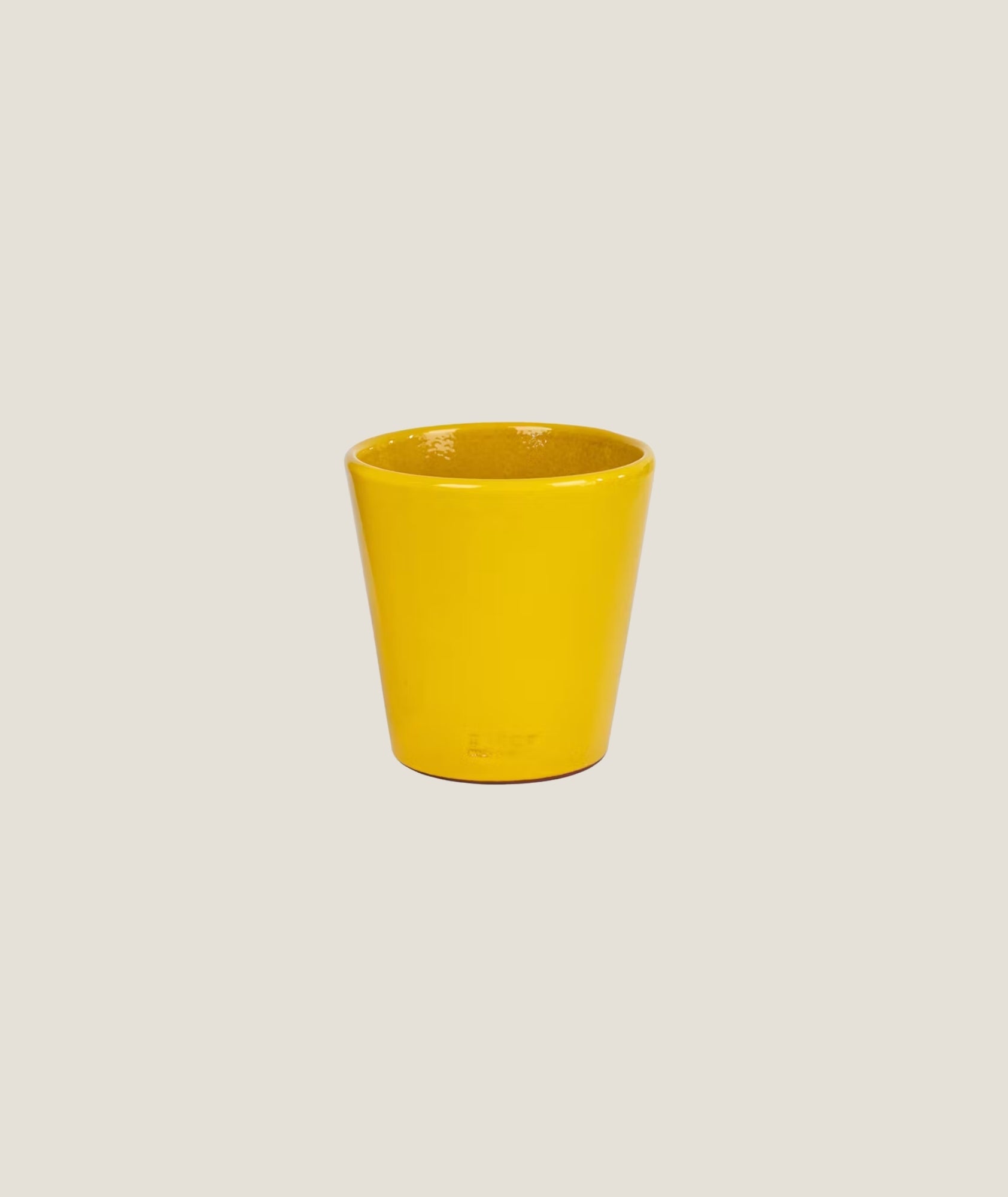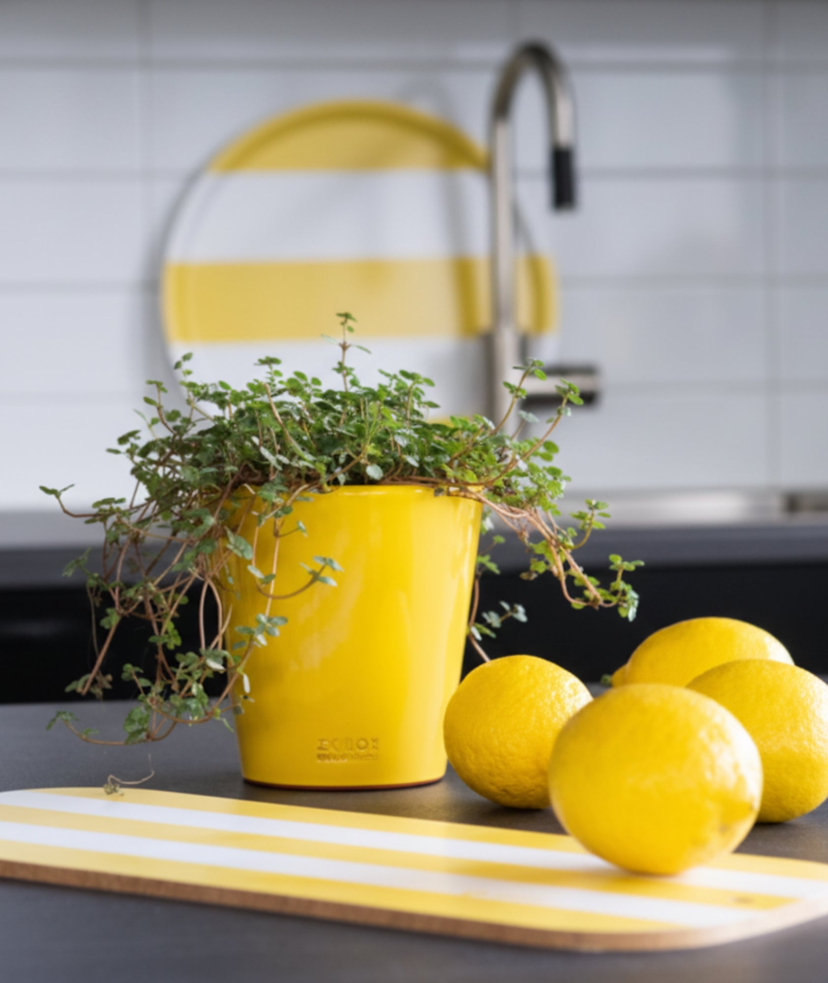 Blomkruka gul är en vacker och uttrycksfull kruka som kombinerar genuint hantverk med modern design. Tillverkad i glaserat lergods, med glasyr på både in- och utsida, får den en elegant glans och en tålig yta som gör den både funktionell och dekorativ. Den solgula färgen sprider värme och ljus i rummet och framhäver växternas gröna nyanser på ett livfullt sätt. Perfekt för allt från blommande växter till örter eller små träd.