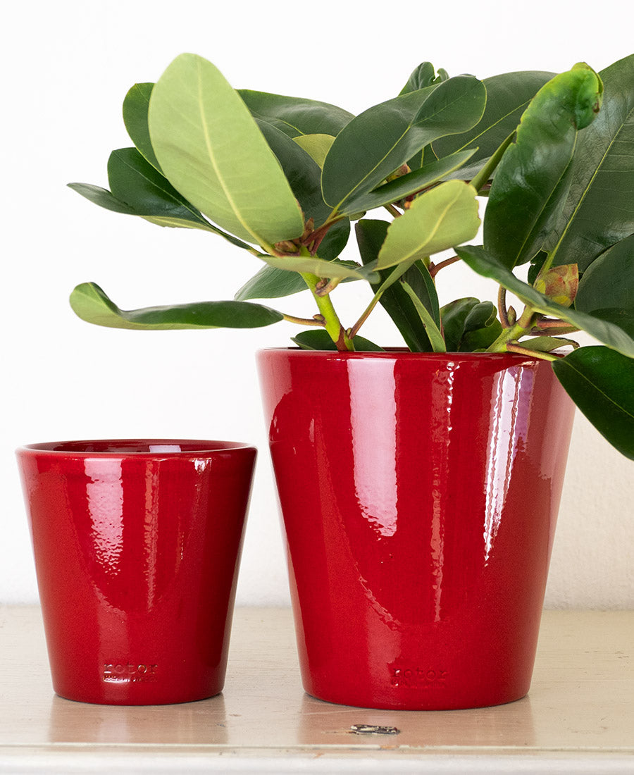 Blomkruka röd är en elegant och uttrycksfull kruka som kombinerar klassiskt hantverk med modern design. Tillverkad i glaserat lergods, med glasyr på både in- och utsida, får den en vacker glans och en slitstark yta som tål vardagens användning. Den djupt röda färgen tillför värme och energi till rummet och framhäver växternas gröna nyanser på ett vackert sätt.
