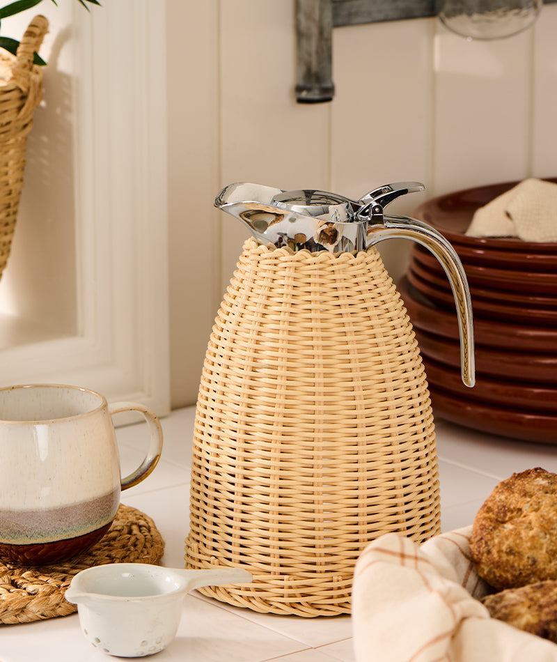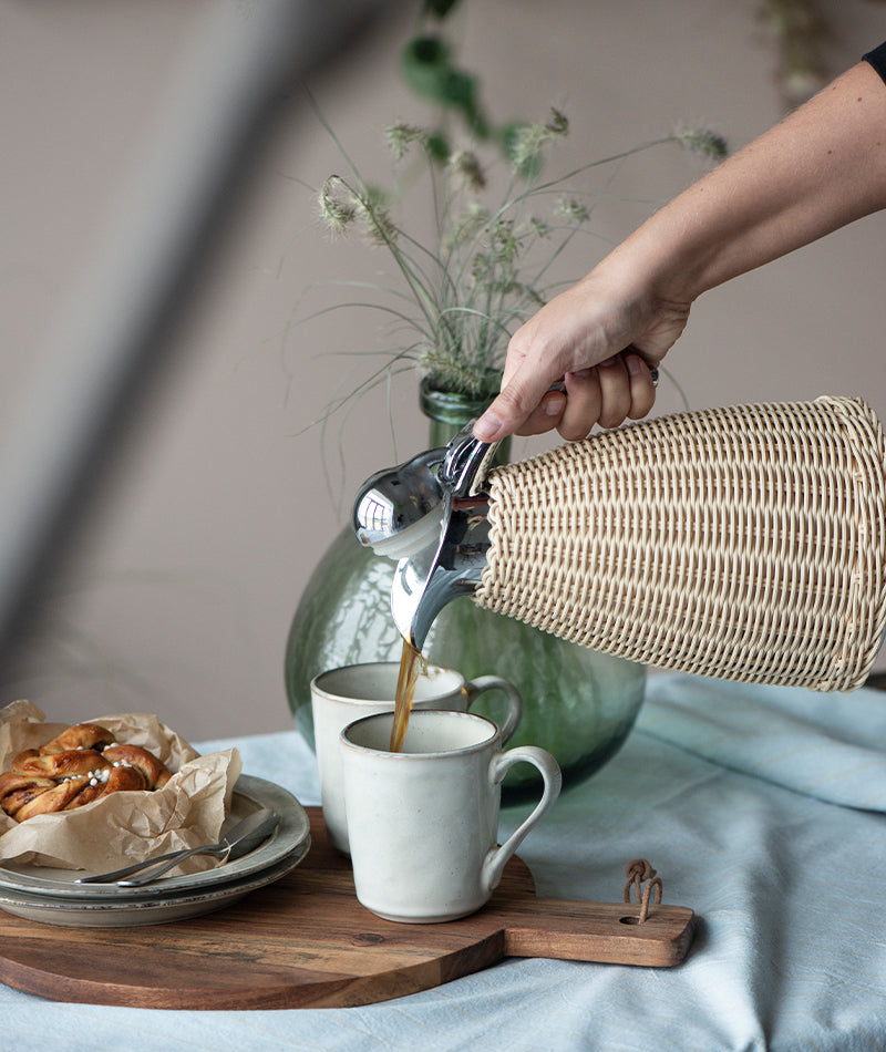 Termoskanna med flätad bambu i naturfärg från IB Laursen är en kombination av stil och funktion som gör den till en idealisk följeslagare för dina dryckesbehov. Denna termoskanna är inte bara praktisk för att hålla dina drycker varma eller kalla, den ger också en naturlig och rustik touch till din servering.