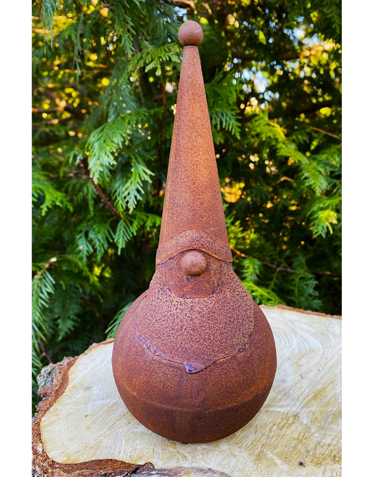 Tomtenissen har en unik design med sin rostiga finish som ger den en rustik och antik look. Den är noggrant utformad med små detaljer som ger den en autentisk karaktär. Dess öppna botten möjliggör enkel placering på olika ytor som trädgården, altanen eller trappan.