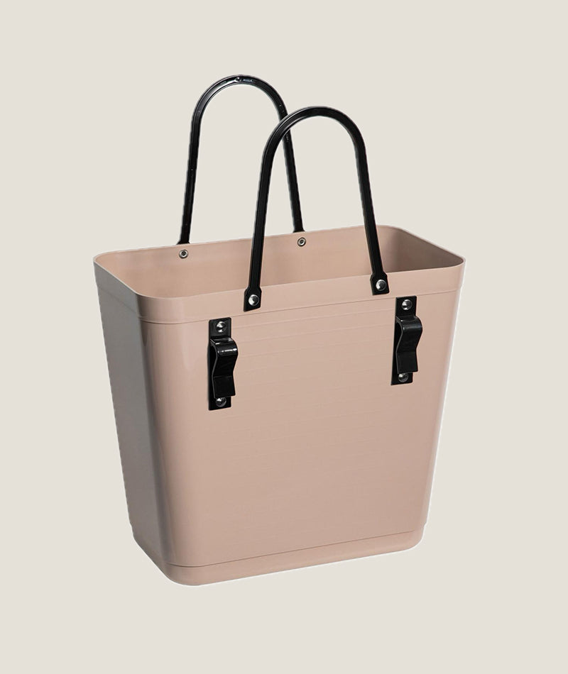 Det här är en högre och något hårdare modell av den klassiska Hinzaväskan som designades på 1950-talet. Den är perfekt att ta med till mataffären, på picknick och till stranden. Väskan har krokar på ena långsidan som gör att du kan fästa väskan på cykelns pakethållare och får på så vis en praktisk cykelkorg som går att ta av och på.