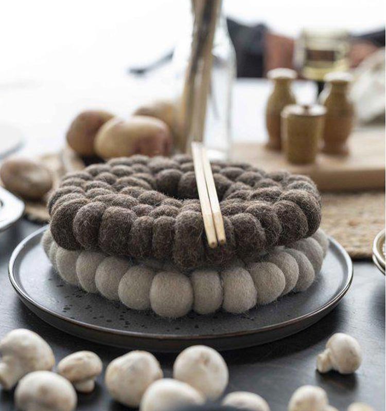 Våra grytunderlägg av tovad ull kombinerar praktisk funktion med stilfull design. Den naturliga värmeavvisande egenskapen hos ull gör dem till en oumbärlig del av din köksutrustning. Med enkelhet och elegans kommer dessa grytunderlägg att höja din dukning till en ny nivå av stil och funktionalitet.