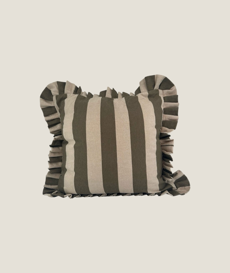 Ett vackert kuddfodral i 100% bomull med mjuka ränder i natural och olive. De dekorativa volangkanterna skapar ett charmigt och ombonat uttryck som lyfter soffan eller sängen. En stilfull detalj som tillför lugn och naturlig elegans i rummet.