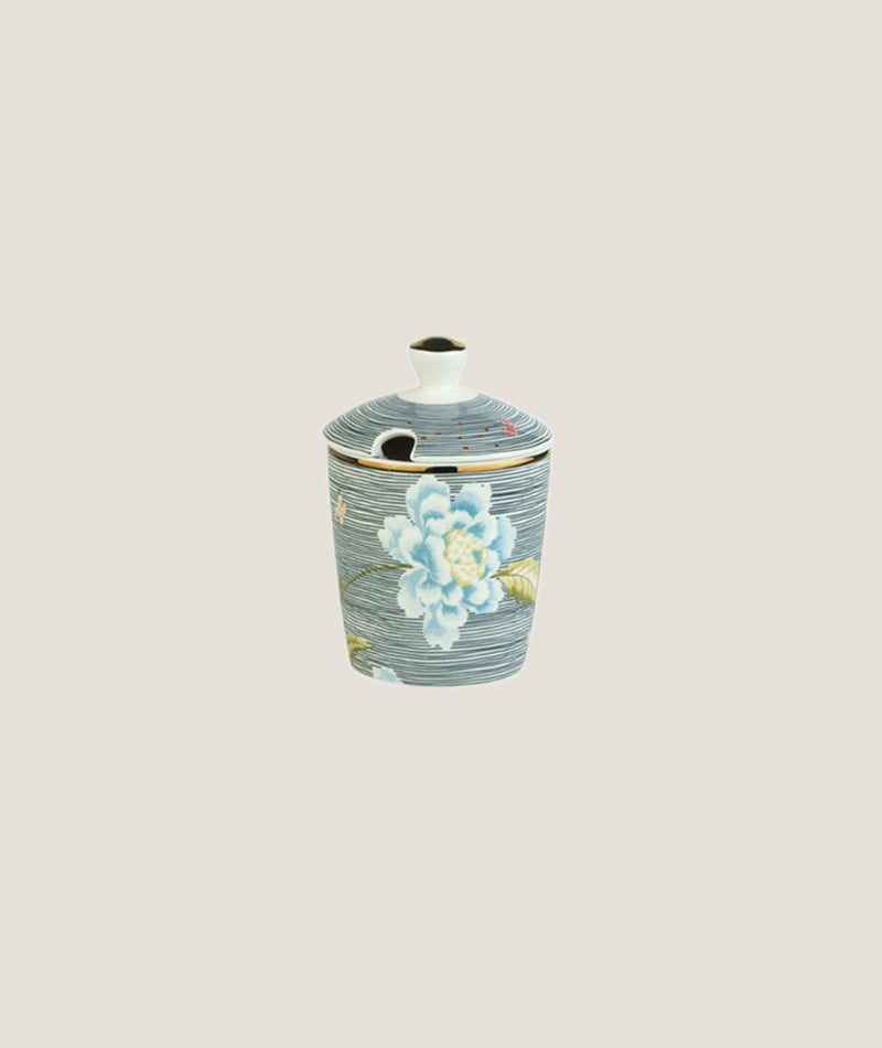 Sockerskålen har ett förtrollande blommönster mot en mörkblå bakgrund med smala ränder i beige som skapar en subtil kontrast. Guldkanten adderar en touch av lyx och förstärker skålens eleganta utstrålning.