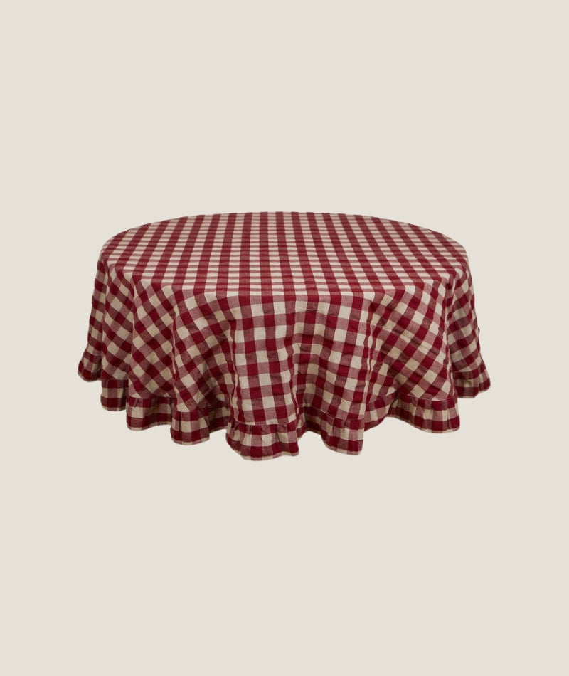LIsa klassisk rutig rund duk i vacker röd färg som passar de flesta dukningar. Bordsduken är tillverkad i återvunnen textil.