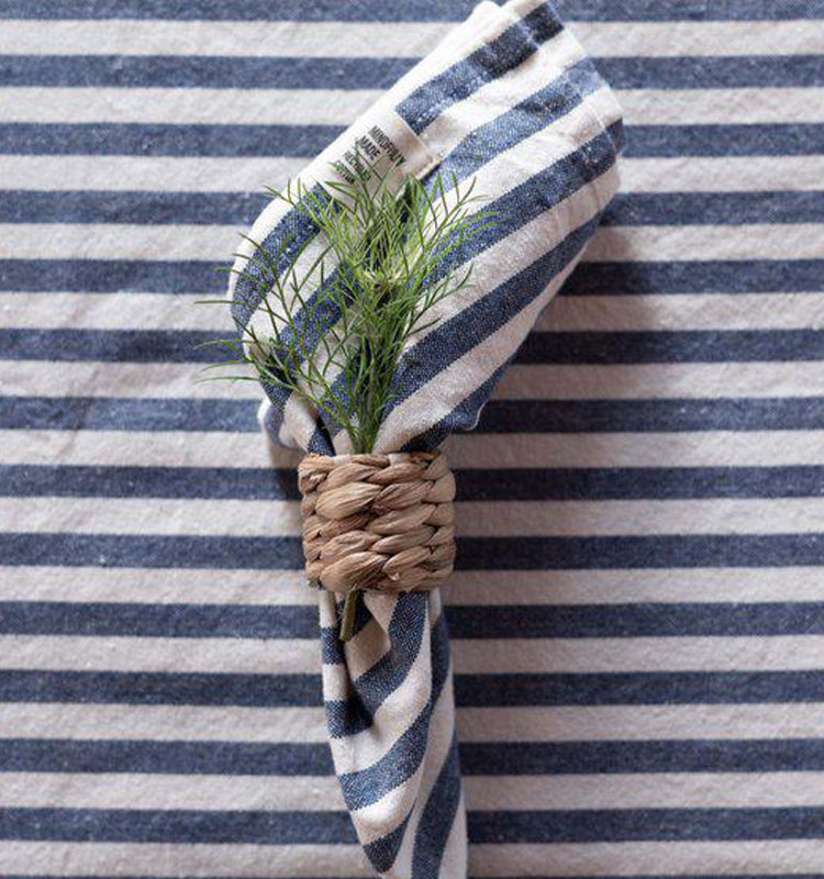 Den Denim blå servetten "Svea"  med klassisk rand ger en koppling till naturen och dess skönhet. Den funkar för både utomhusbruncher och trädgårdsmiddagar , där den fräscha nyansen ger en harmonisk och avslappnad atmosfär.